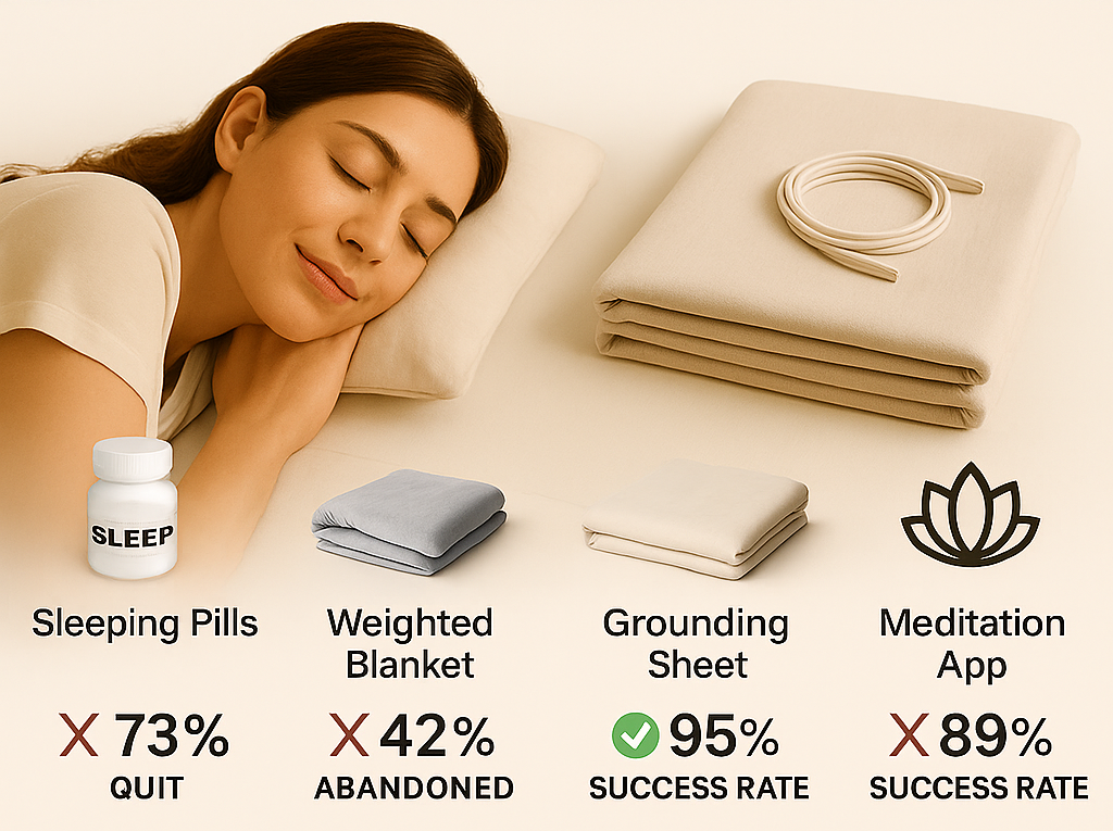 Over 200,000 customers. Less than 5% returns. Those aren't marketing numbers - check our verified reviews. Compare that to sleeping pills (73% quit within a year), weighted blankets (42% end up in closets), or meditation apps (89% abandon after month one). Why the difference? Because grounding addresses the root cause - disconnection from Earth's electrical field - not symptoms. When you fix the cause, everything else follows.